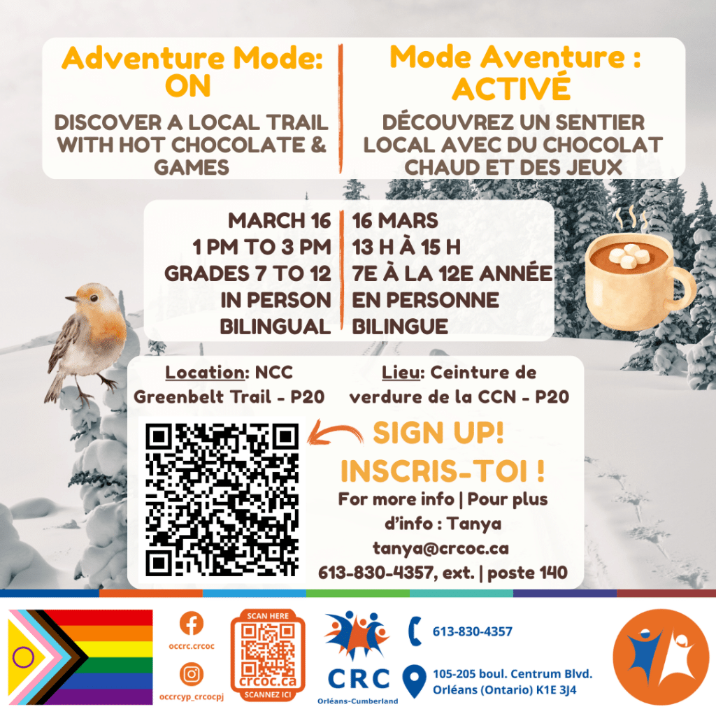 L’inscription ouvre le lundi de la semaine précédente à 8 h 30 et fermera le jour de l’activité à midi. Si l’inscription en ligne vous pose problème, veuillez envoyer un courriel à Isabel ou appeler 613-830-4357, poste 152.