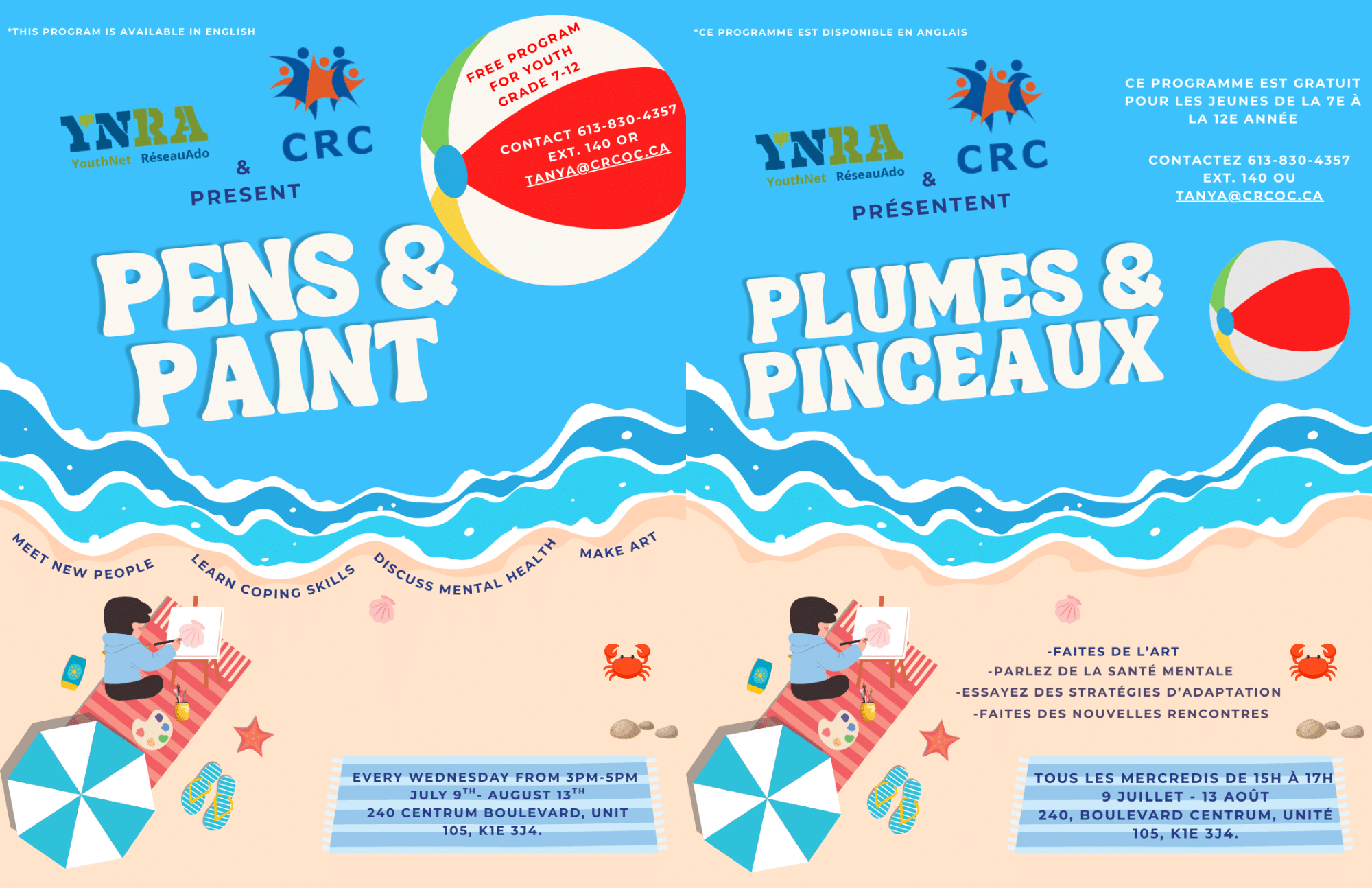 We’re thrilled to partner up with YNRA (YouthNet/RéseauAdo) to offer Pens & Paint this summer! Join us to meet new people, make art, learn coping skills and discuss mental health!