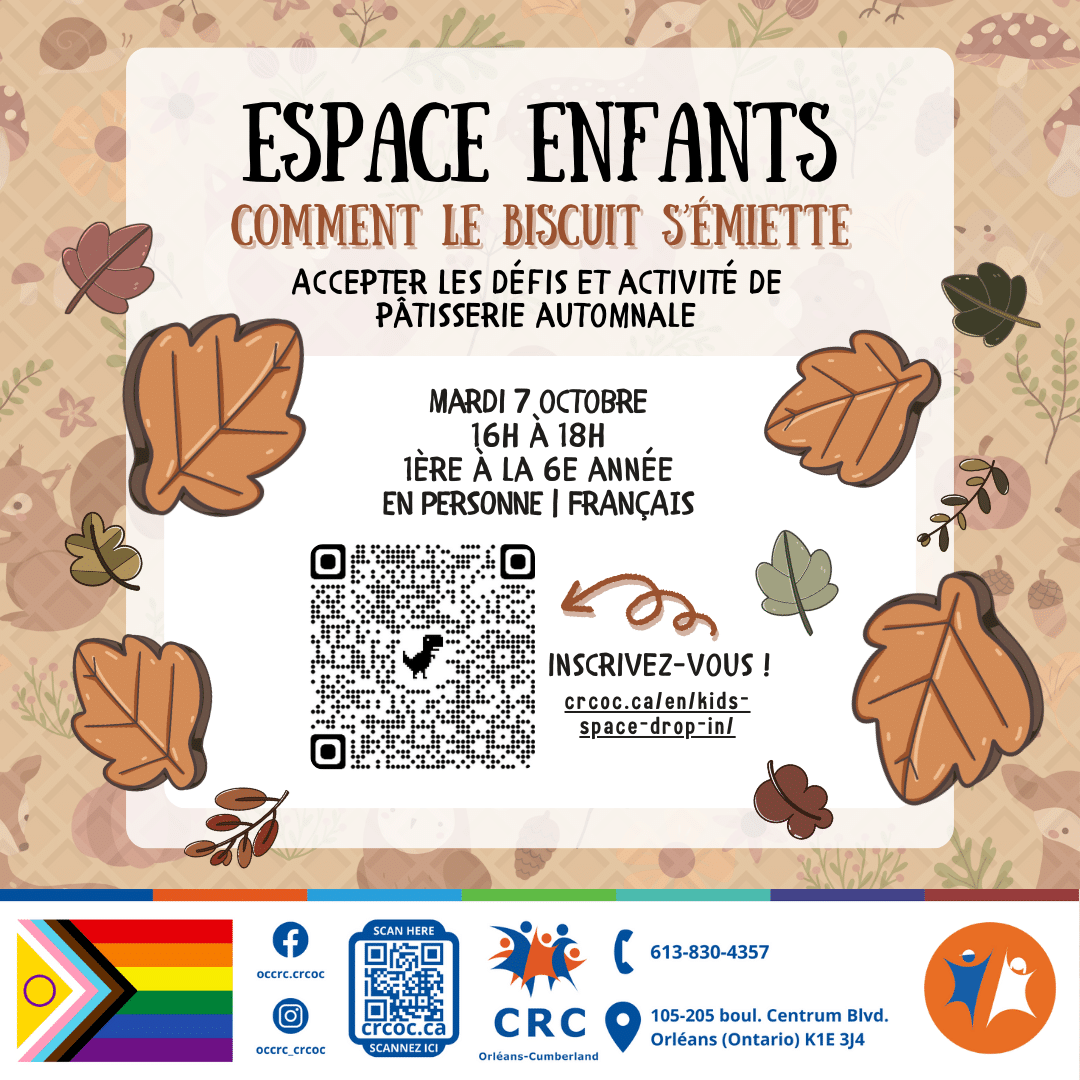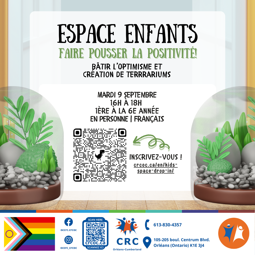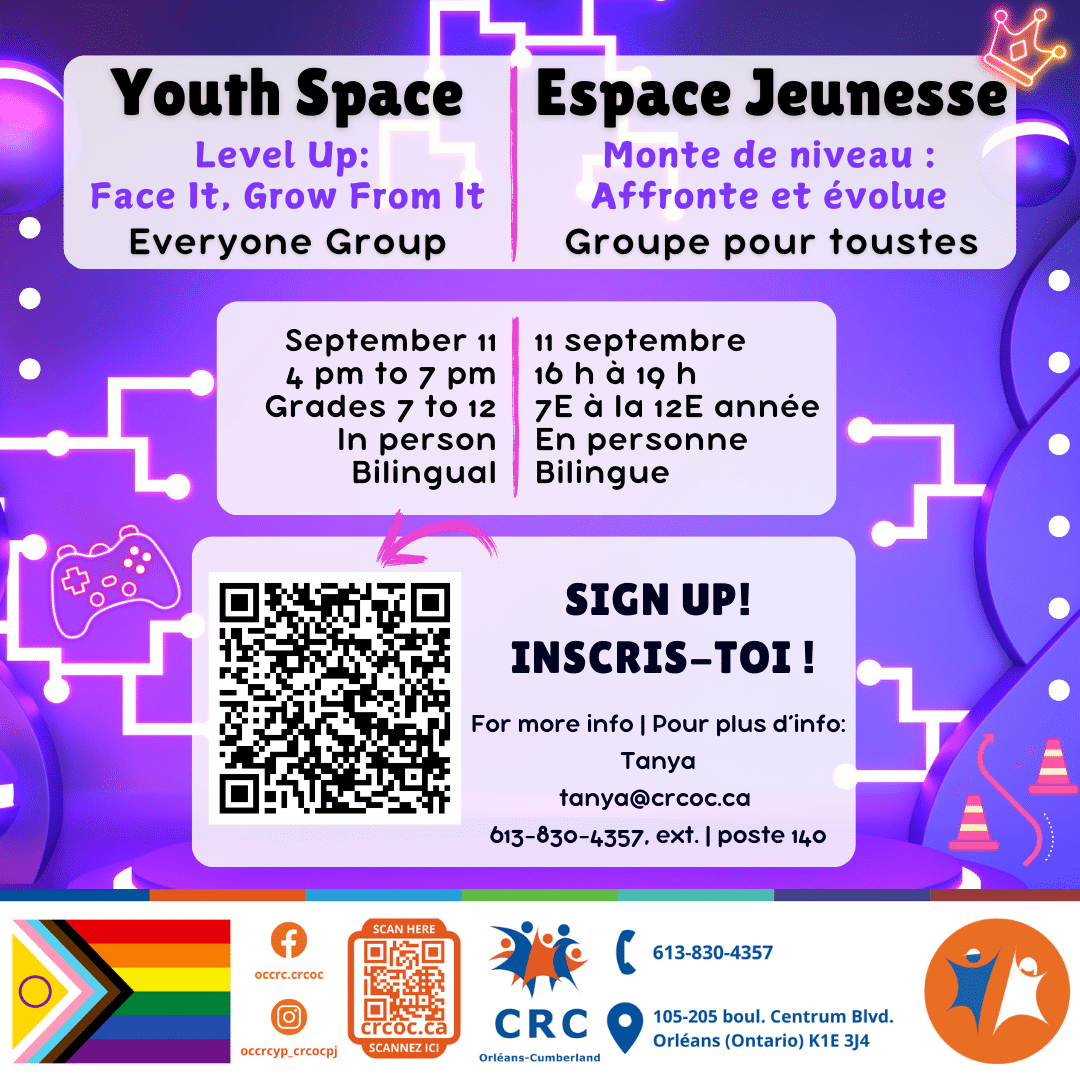 OCCRC | CRCOC 240 Centrum Blvd, Orléans, Orléans, CanadaGRADES 7 TO 12 | BILINGUAL | IN PERSON | LIMITED SPOTS (MAX. 15) **Please note, Youth Space hours have changed for the summer.** A safe and inclusive space to connect with peers, be themselves, have fun, relate to others and talk about things important to them. Everyone Group: August 14th from 3 PM to 6 ... -> READ MORE - LIRE PLUS