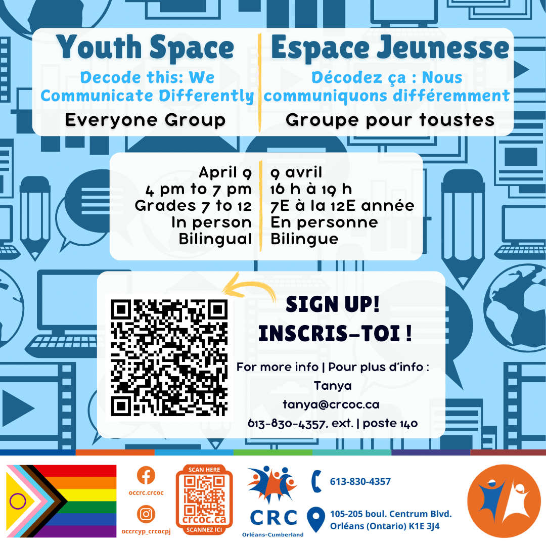 GRADES 7 TO 12 | BILINGUAL | IN PERSON | LIMITED SPOTS (MAX. 15) A safe and inclusive space to connect with peers, be themselves, have fun, relate to others and talk about things important to them. Everyone Group: April 9th from 4 PM to 7 PM Theme: Decode this: We communicate differently Activities: Guess ... -> READ MORE - LIRE PLUS